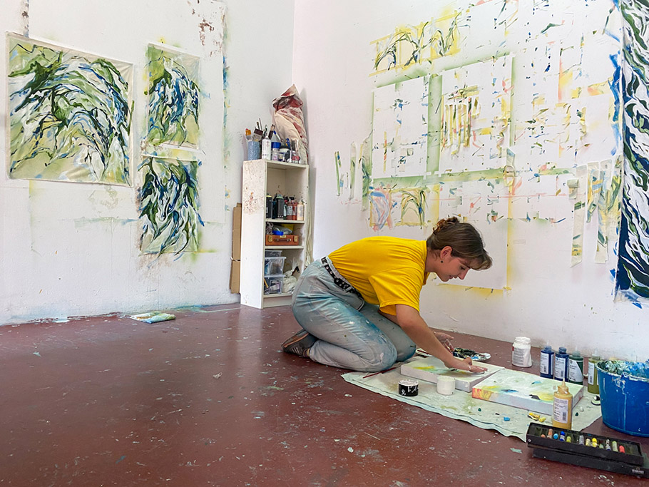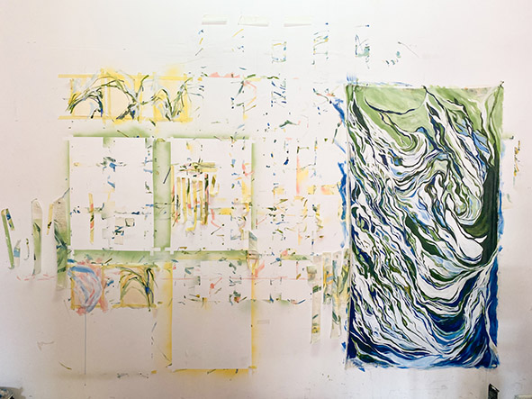 Con frecuencia tengo una sensación, y es, que soy incapaz de nombrar lo que me recorre. Siempre podría haber otra palabra. Cuando pinto ocurre algo parecido, siempre podría haber otro azul, otro verde y otro amarillo más cercanos a mi sensación de amarillo, verde o azul. Lo que pronuncio no se corresponde a lo que siento, hay una línea fina e inmensa entre el nombre y la sensación frente al nombre. Ahí residen los colores en mi trabajo. Busco atenuar esa línea o sentirla con más intensidad.